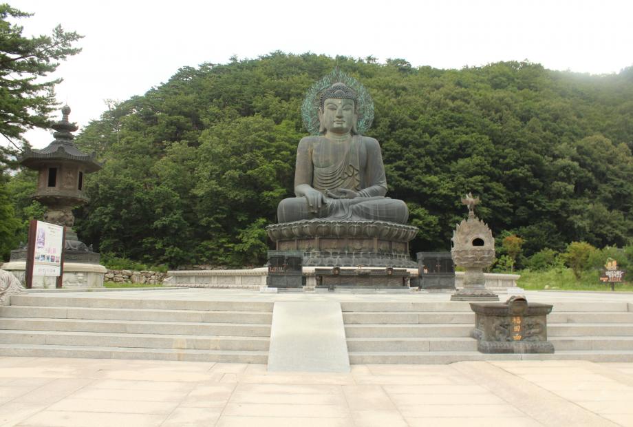 Bei der Ankunft kommt man zunächst durch ein riesiges Portal im Stil der traditionellen koreanischen Architektur. Korea hat viele tolle Nationalparks, die allerdings alle ein wenig ab vom Schuss liegen. Aber ich möchte wahnsinnig gerne noch mehr sehen, wenn ich die Gelegenheit haben sollte. Die Flora und Fauna dort ist wirklich sehr beeindruckend und man kann bei jedem Schritt und Tritt Insekten und Pflanzen beobachten, die man noch nicht kennt. Im Sommer ist auch das Hintergrundgeräusch, das klingt wie eine schwingende Sinuskurve, sehr beeindruckend. Wie ich mittlerweile gelernt habe verbergen sich dahinter Maemis – koreanische Singzikaden. Das tolle an den koreanischen Nationalparks ist, dass die Ausschilderung recht gut ist und man sich zumeist zurecht findet, wenn man den Schildern folgt. Bereits kurze Zeit nach dem Eingang des Parks treffe ich auf den Sinheungsa Tempel buddhistischen Jogye Ordens. Besonders beeindruckend ist hier die 14,6 Meter hohe Great Unification Buddha-Statue aus Bronze, die den Wunsch nach Wiedervereinigung mit dem Norden Koreas darstellt. Das ist eine der größten sitzenden Bronze-Buddha-Statuen der Welt und man fühlt sich doch reichlich klein und unbedeutend daneben. Ganz in der Nähe befindet sich die Hyeonsugyo-Brücke von der aus man bereits einen tollen Blick auf die Berge sowie auf das Flussbett und eine weitere Brücke hat. Die schöne Landschaft genieße ich schweigend.